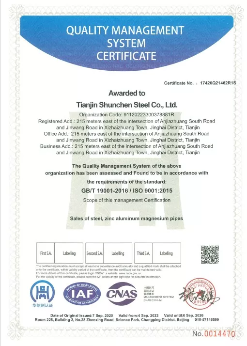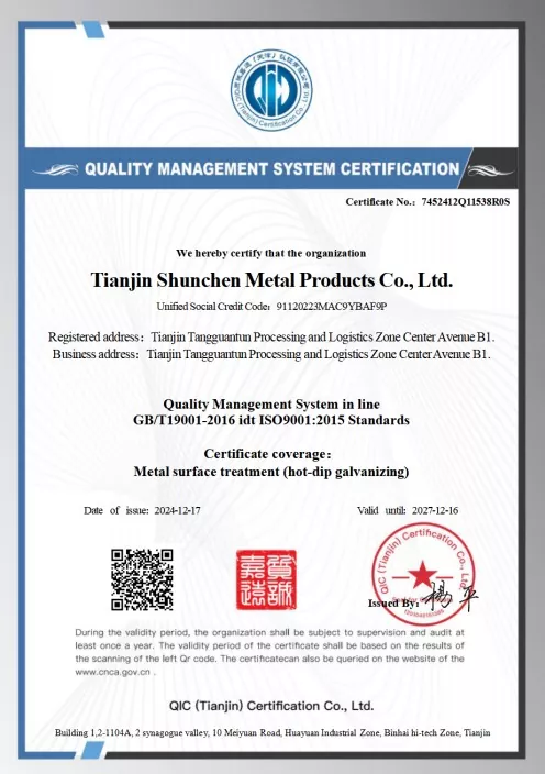Standartlar: GB/T 3091-2015 "Düşük Basınçlı Sıvı Taşımacılığı için Kaynaklı Çelik Borular", GB/T 13912-2020 "Sıcak Daldırma Galvanizli Çelik Borular". Ürün üçüncü taraf testlerini geçmiştir ve bir test raporuna sahiptir.