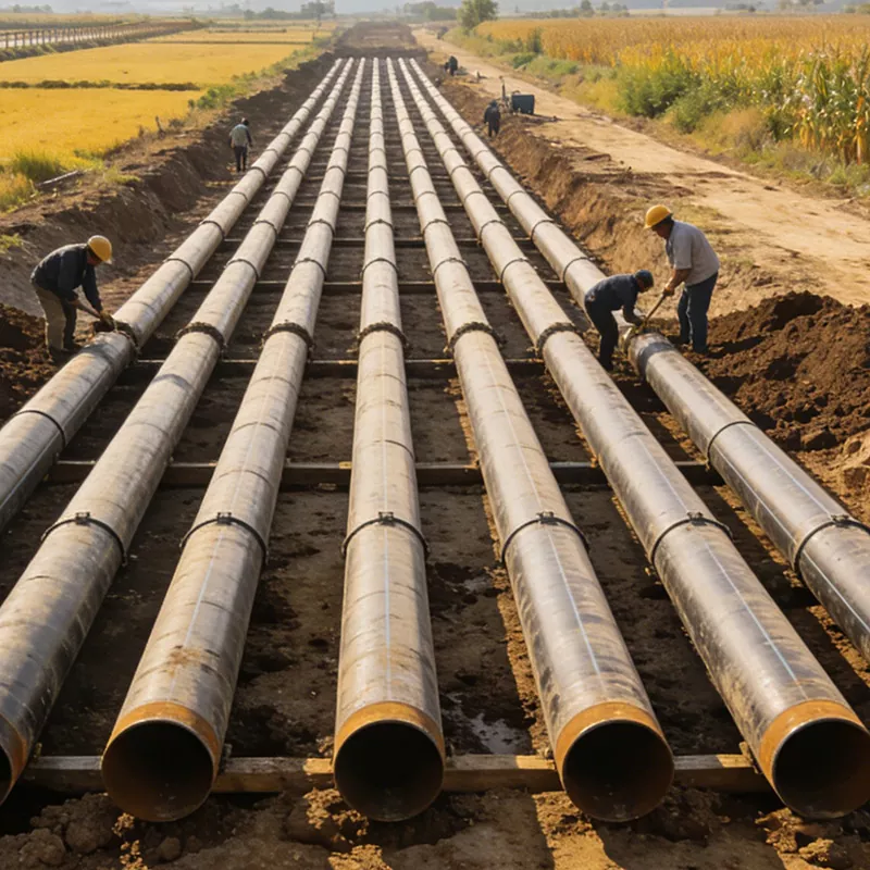 Uygulanabilir senaryolar: Büyük ölçekli su yönlendirme projeleri, su transfer projeleri, taşkın kontrolü ve drenaj projeleri, tarım arazilerinin sulanması için ana boru hatları, içme suyu için su temini projeleri, ada su temini projeleri vb. Temel gereksinimler yüksek akış kapasitesi, korozyon direnci ve su basıncına dayanıklılıktır. Nehir yatakları, tuzdan etkilenen topraklar vb. gibi karmaşık ortamlara uyarlanabilirler. Su erozyonuna ve jeolojik çöküntüye etkili bir şekilde direnebilirler, su kaynaklarının istikrarlı bir şekilde iletilmesini sağlarlar ve su koruma projelerinin güvenli bir şekilde çalışmasını garanti ederler. Önemli ulusal su koruma projelerinde önemli bir destekleyici rol oynuyorlar. Olay yeri açıklaması: Jinghai Su Derivasyon Projesi'nin inşaat sahasında, ana boru hattının döşenmesi için geniş çaplı spiral borular kullanılıyor. Borular nehirlerden veya tarım alanlarından geçiyor ve işçiler arayüz sızdırmazlık işlemini gerçekleştiriyor. Ada su temini proje sahasında, deniz suyu erozyonuna direnmek ve su kaynaklarının ada ile anakara arasındaki bağlantısını sağlamak için 3PE korozyon önleyici teknolojiye sahip geniş çaplı spiral borular kullanılıyor.