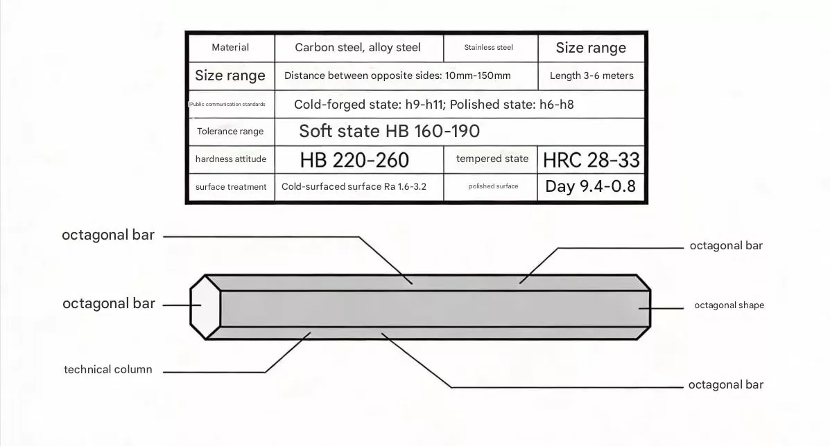 Sekizgen bir kesite ve düz sekizgenler, eksantrik sekizgenler gibi asimetrik bir yapıya veya anahtar yuvaları, yağ yuvaları ve konumlandırma düzlükleri gibi işlevsel özelliklere sahip özelleştirilmiş bir katı metal profil olması nedeniyle standart normal sekizgen çelikten farklıdır.