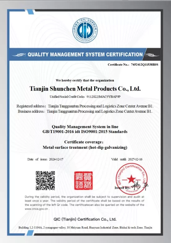 Shunchen Industrial'ın Çelik U Bölümü, ulusal standartları karşılayan ISO9001 kalite sertifikasını aldı. Üçüncü taraf malzeme test raporları ve galvanizleme kalınlık sertifikaları sağlıyoruz. Üretimimiz, 20 yılı aşkın üretim uzmanlığıyla desteklenen, 12 zorlu süreç adımından geçen gelişmiş üretim hatlarını kullanıyor. Sıfır sözleşme ihlali ve sıfır yıllık kalite olayıyla ilgili 12 yıllık bir geçmiş performansımızı sürdürdük. Üretim sürecinde galvanizli ürünlerin anti-alkali direncini arttırmak için üç pasivasyon işlemi uygulanmaktadır. Her bitmiş ürün, paketlenip gönderilmeden önce kurutma, inceleme ve bitirme işlemlerinden geçer. Şirket, ISO 9000, 3A sistem sertifikalarına ve AB CE sertifikasına sahiptir. 12 süreç adımımız ve üç aşamalı kapsamlı denetim mekanizmamızla, yıllık sıfır kalite ve güvenlik olayına ulaştık ve 12 yıllık sıfır sözleşme ihlali kaydını sürdürdük.